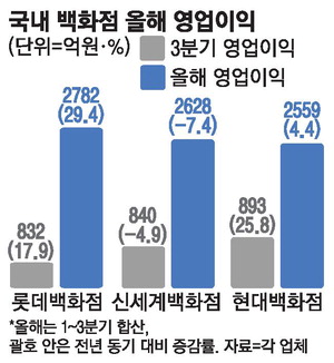 신세계백화점은 3분기 순매출이 6227억원을 기록했는데 이는 지난해 같은 기간과 비교했을 때 0.5% 오른 수치다. 다만 미래 전략적 투자가 지속됨에 따라 영업이익은 840억원으로 이 기간 소폭 감소했다. 신세계백화점은 지난해부터 올해 8월까지 강남점 식품관 리뉴얼 작업을 진행했고, 본점·강남점 등 주요 점포의 패션 카테고리를 새 단장하고 있다.