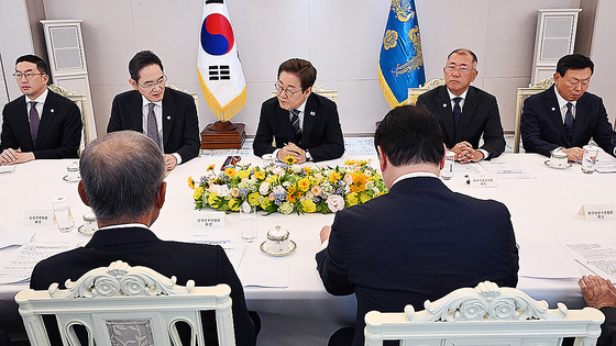 이재명 대통령이 취임한 직후인 지난 6월 13일 서울 용산 대통령실 청사에서 재계 총수와 간담회를 갖고 있다. 사진 왼쪽부터 구광모 LG그룹 회장, 이재용 삼성전자 회장, 이 대통령, 정의선 현대차그룹 회장, 신동빈 롯데그룹 회장. 대통령실사진기자단 |