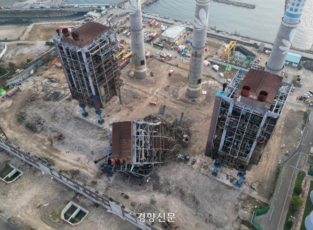 울산화력발전소 보일러 타워 붕괴 사고 이틀째인 7일 울산시 남구 용잠동 한국동서발전 울산발전본부 울산화력발전소 사고 현장에 보일러 타워가 무너져 있다. 권도현 기자 |