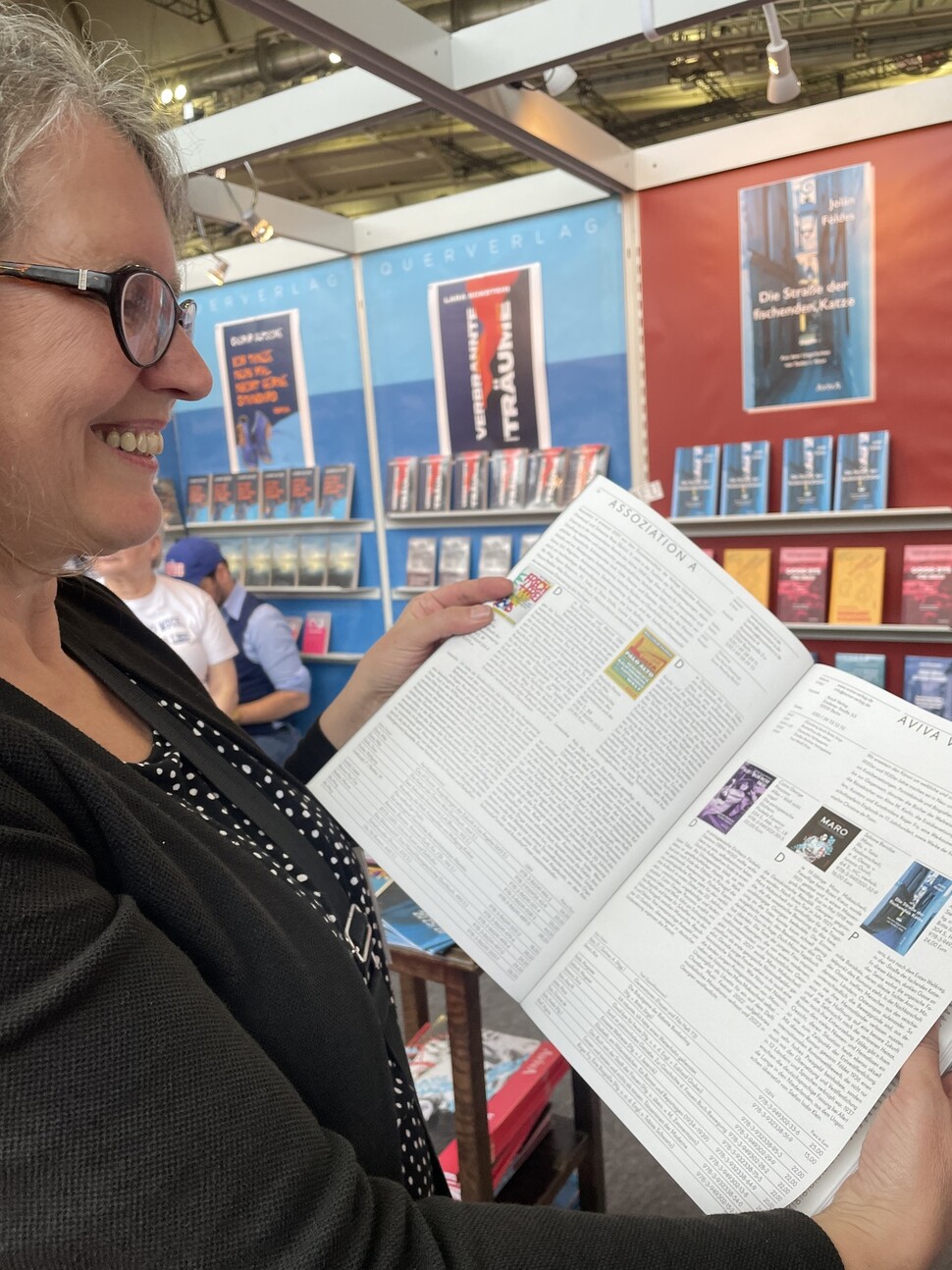 아비바 출판사 브리타 위르크스 대표가 독립출판사의 성과를 담은 카탈로그 ‘책에 관한 이야기’(Es geht um das Buch)를 펼쳐 보이면서 “지금 막 나온 따끈따끈한 책”이라고 기뻐하고 있다. |