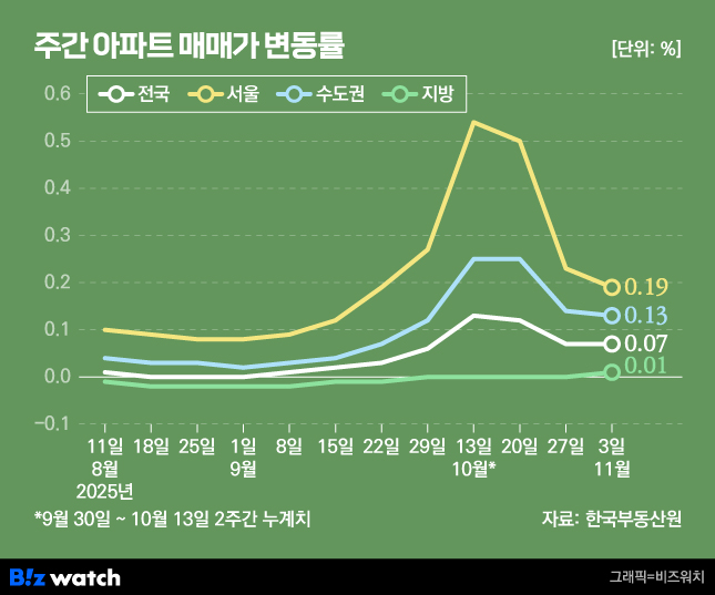 한국부동산원의 11월 첫째 주(3일 기준) 아파트 가격 동향에 따르면 서울 아파트 매매가격이 일주일 새 0.19% 올랐어요. 전주 상승률(0.23%)과 비교하면 0.04%포인트 낮아진 수치에요.