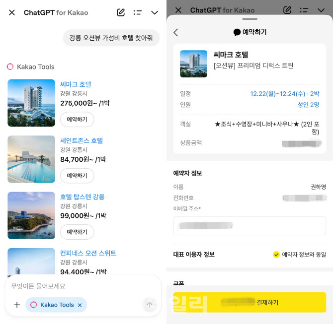 이번에는 카카오 툴즈를 활성화한 상태로 동일한 질문을 던져봤다. 그러자 강릉 소재 주요 호텔 이름과 1박당 가격 정보가 각각 ‘예약하기’ 버튼과 즉각 제시됐다. 호텔마다 정보를 확인해보고 마음에 드는 곳 하나를 골라 ‘예약하기’를 눌렀더니, 곧장 ‘카카오톡 예약하기’ 서비스와 연동돼 일정·인원·객실 선택 화면이 뜨고 카카오페이 결제까지 한 번에 이뤄졌다.