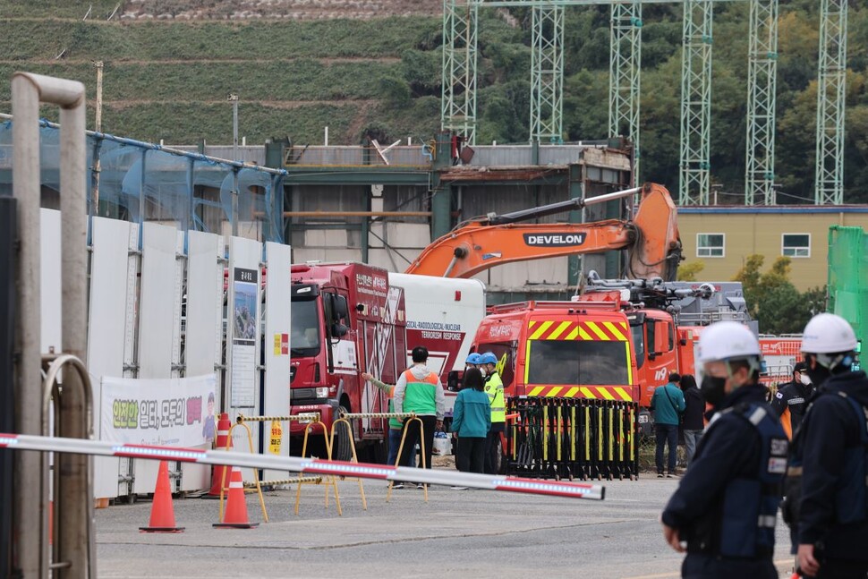 한국동서발전 울산발전본부 울산화력발전소 보일러 타워 붕괴 사고 사흘째인 8일 오전 119 구조대 차량이 발전소 후문을 통과하고 있다. 이날 오전 8시 현재까지 매몰자는 총 7명으로 실종자 2명을 제외하고 사망자는 3명, 사망 추정자는 2명이다. 연합뉴스 |