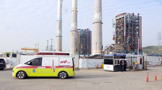 울산화력발전소 보일러 타워 붕괴 사고 현장에서 7일 오전 구급차가 심정지 상태로 구조된 매몰자를 이송하고 있다. 연합뉴스 |