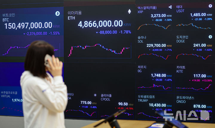 [서울=뉴시스] 권창회 기자 = 5일 서울 강남구 업비트 고객센터에 비트코인을 비롯한 가상화폐 가격이 나오고 있다. 가상화폐 시가총액 1위 비트코인이 지난 6월 이후 처음으로 10만 달러 아래로 떨어졌다. 비트코인 가격이 10만 달러 아래로 떨어진 것은 미국이 이란 핵시설을 공격해 중동 긴장이 고조되고 있던 지난 6월 이후 처음이다. 2025.11.05. kch0523@newsis.com |