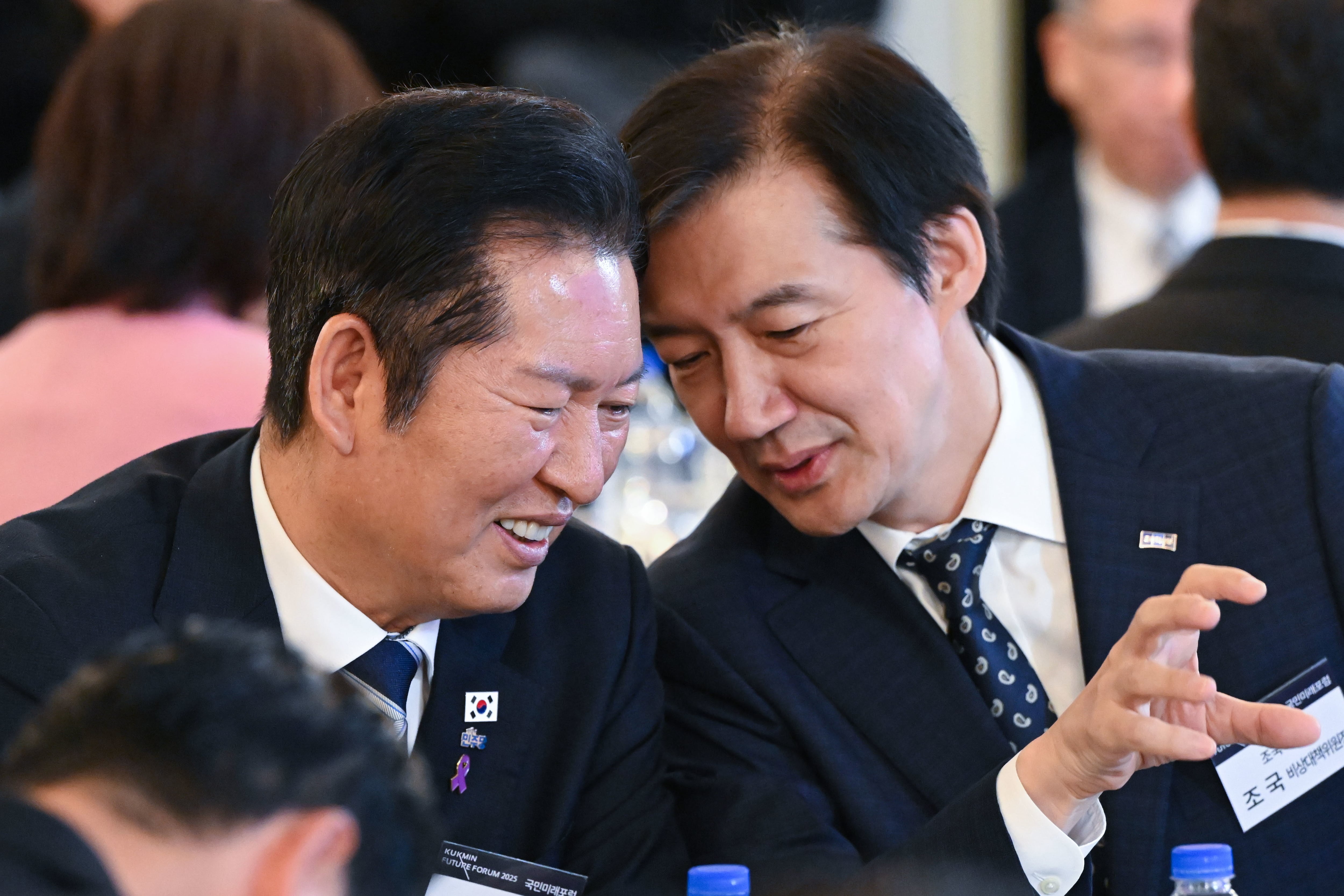 정청래 더불어민주당 대표와 조국 조국혁신당 비상대책위원장이 지난 달 23일 서울 영등포구 CCMM빌딩에서 열린 2025 국민미래포럼 '선도국가로의 퀀텀점프 : 과학기술이 여는 새로운 성장’에서 만나 대화를 하고 있다. /뉴스1 |