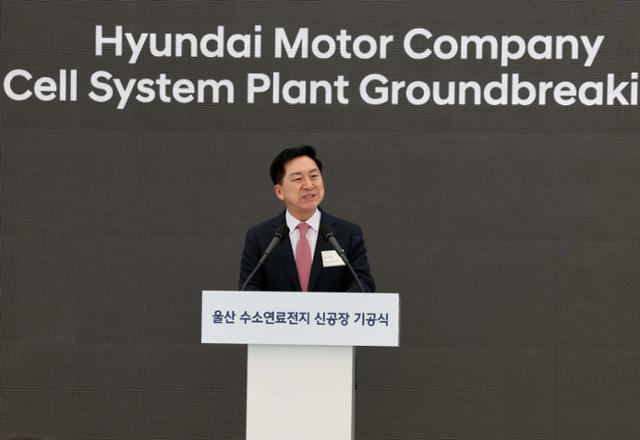 지난달 30일 오전 울산시 북구 현대자동차 울산공장에서 열린 수소연료전지 신공장 기공식에서 김기현 국회의원이 축사하고 있다. 연합뉴스 |