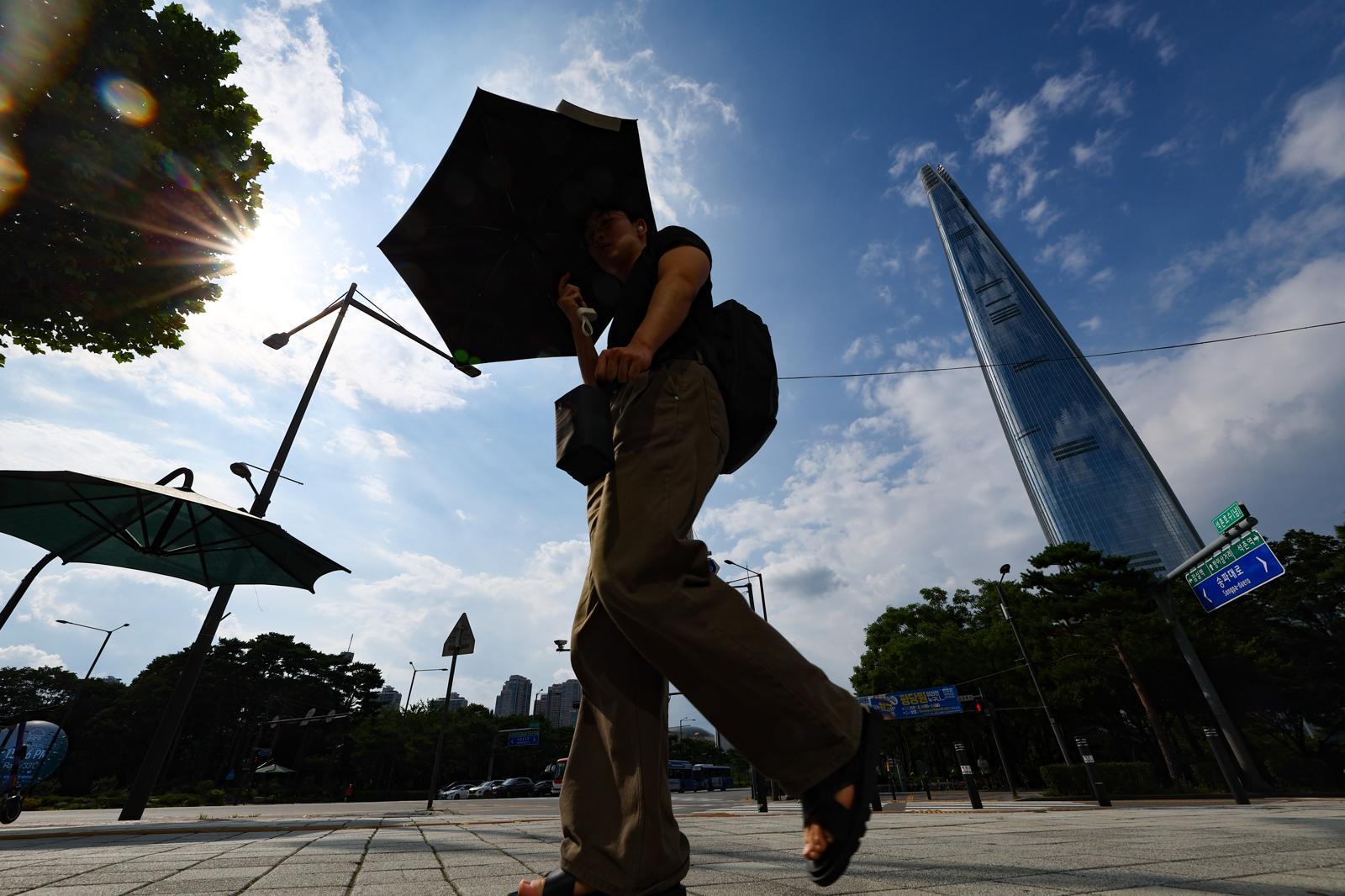 폭염경보가 발효된 8월 서울 송파구 석촌호수 사거리에서 양산을 쓴 시민들이 발걸음을 옮기고 있다. 사진=뉴시스 |