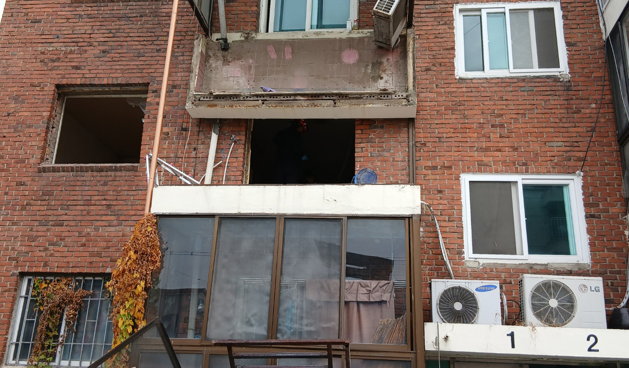 ▲ 8일 낮 12시 49분께 전북 전주시 덕진구의 한 빌라에서 발코니가 무너져 리모델링 공사를 돕던 50대가 사망했다. 사진은 무너진 발코니.