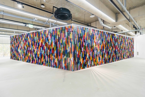 설치 작품 '죽림-오감도'는 전시장 한가운데를 가로지르는 대형 설치물이다. 버티컬 블라인드에 작가가 배색한 오방색을 프린트했다.
