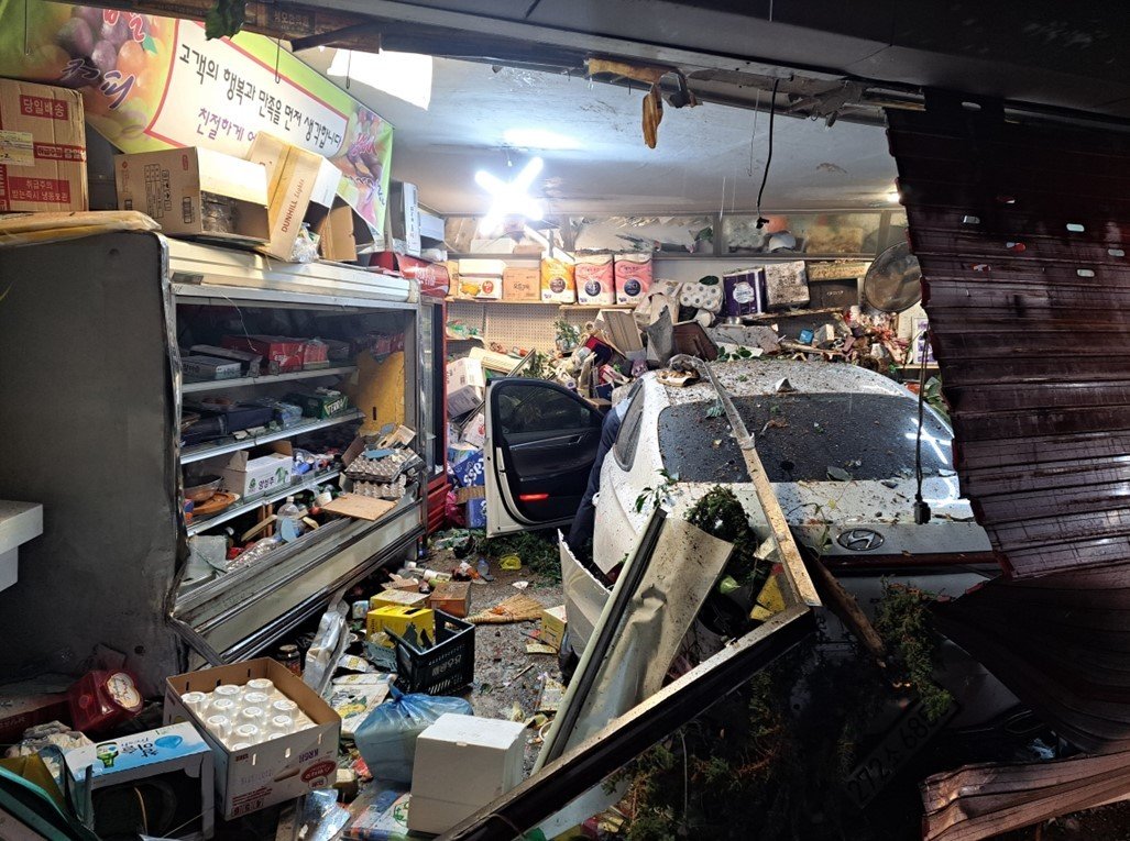 사고 당시 사진에는 마트의 셔터 문을 뚫고 들어간 차량의 모습이 담겨 있다. 이에 마트 안은 부서진 집기와 떨어진 물건들로 아수라장이 됐다.