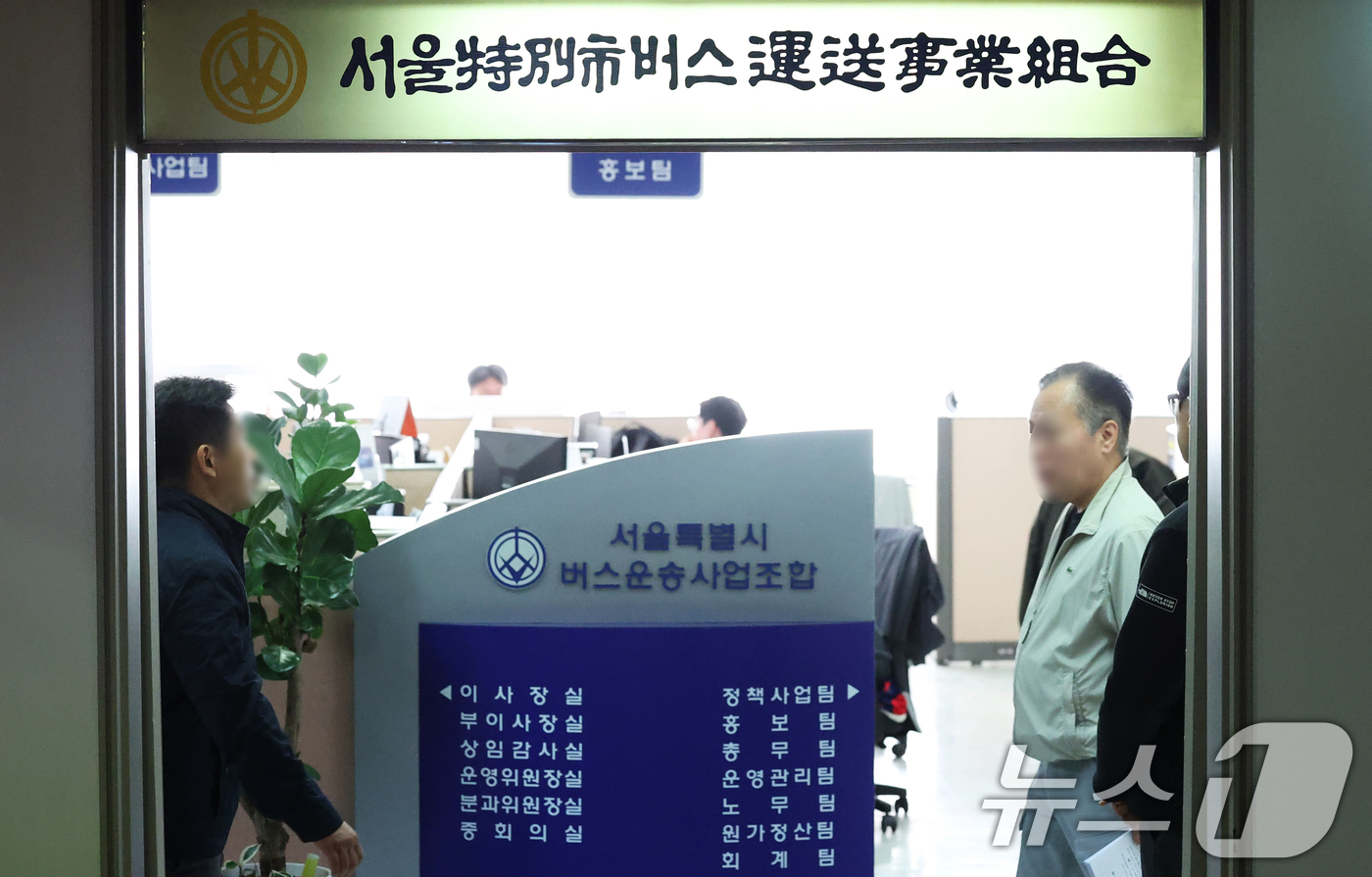 7일 오후 서울 송파구 서울버스운송사업조합에서 열린 서울시내버스 중앙노사교섭회의를 앞두고 관계자들이 분주히 오가고 있다. 서울시내버스 노조는 오는 11일 자정까지 임금·단체협상을 둘러싼 입장 차이를 좁히지 못하면 수능 하루 전인 12일 새벽 첫차부터 파업에 돌입하겠다는 입장이다. 2025.11.7/뉴스1 ⓒ News1 오대일 기자 |