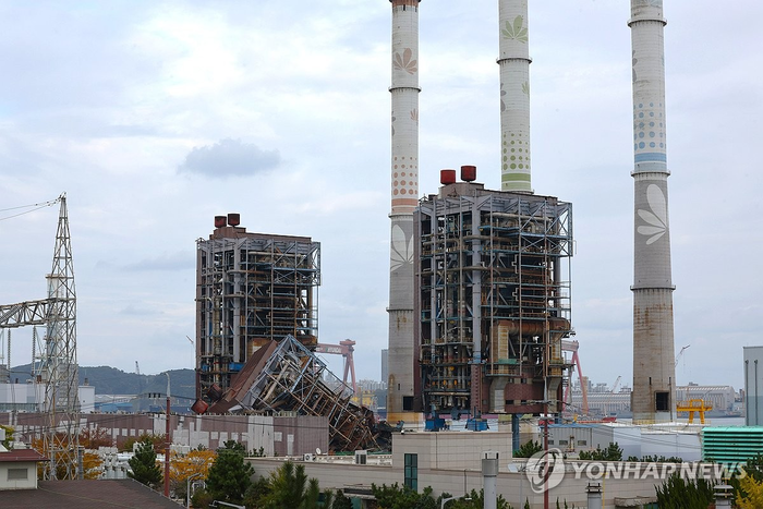 한국동서발전 울산발전본부 울산화력발전소 내 보일러 타워 붕괴 사고 나흘째인 9일 오전 발전소 내 붕괴한 기력 5호기. 이 사고로 현재까지 3명 사망, 2명 사망 추정, 2명이 실종 상태다. [연합뉴스] |