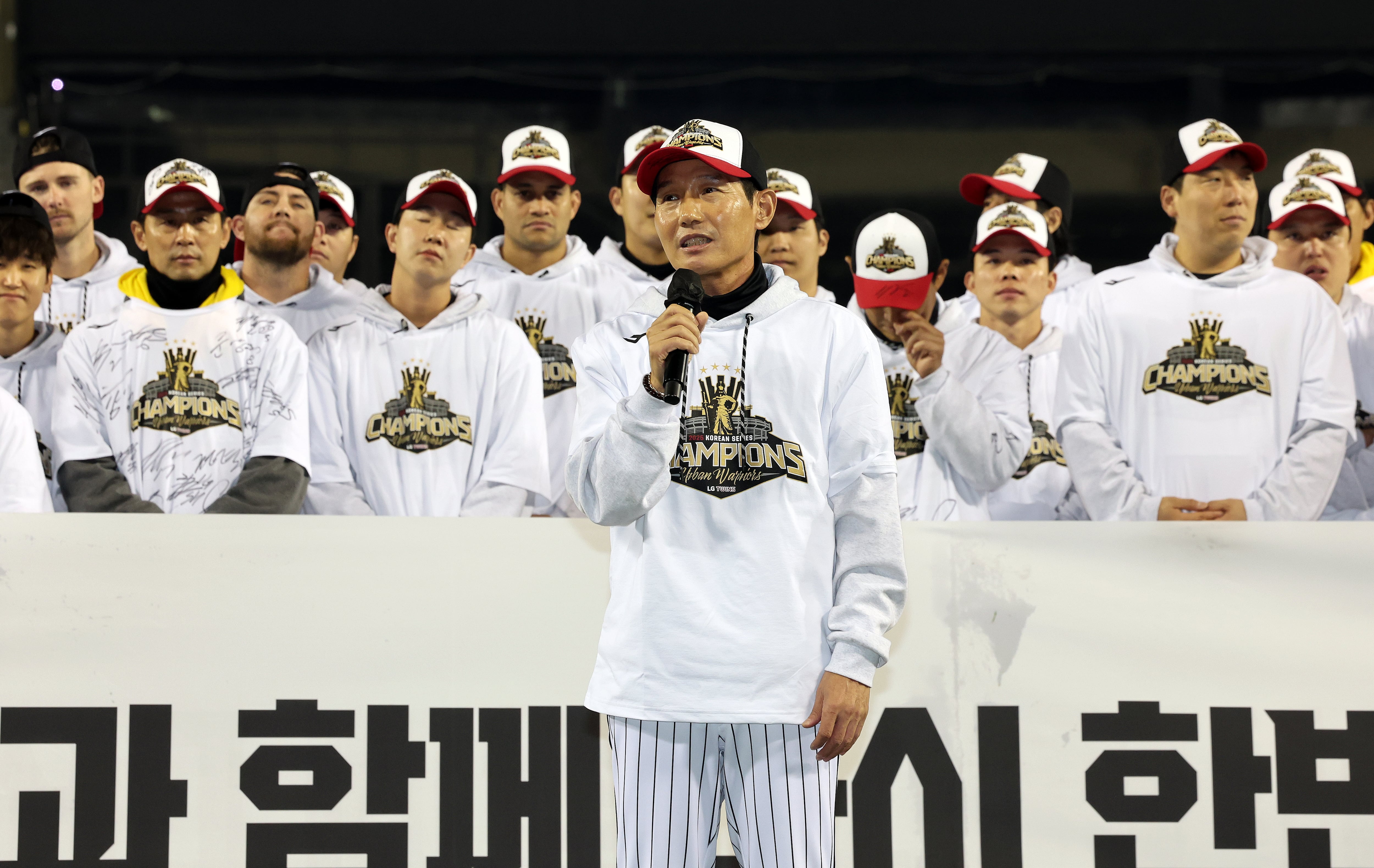LG 염경엽 감독이 1일 서울 송파구 잠실야구장에서 열린 프로야구 2025 한국시리즈 우승 세리머니 팬 감사 행사 '더 리턴 오브 챔피언스'(The Return of Champions)'에서 팬들에게 감사 인사를 전하고 있다. /뉴스1 |