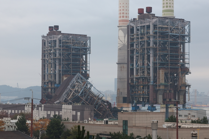 한국동서발전 울산발전본부 울산화력발전소 사고 나흘째인 9일 무너진 보일러 타워 5호기 양옆으로 4·6호기가 위태롭게 서 있다. [연합뉴스] |