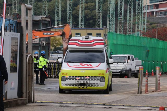 9일 오전 한국동서발전 울산화력발전소에서 세 번째 수습된 사망자 시신을 실은 구급차가 사고 현장에서 나오고 있다. 울산=연합뉴스 |