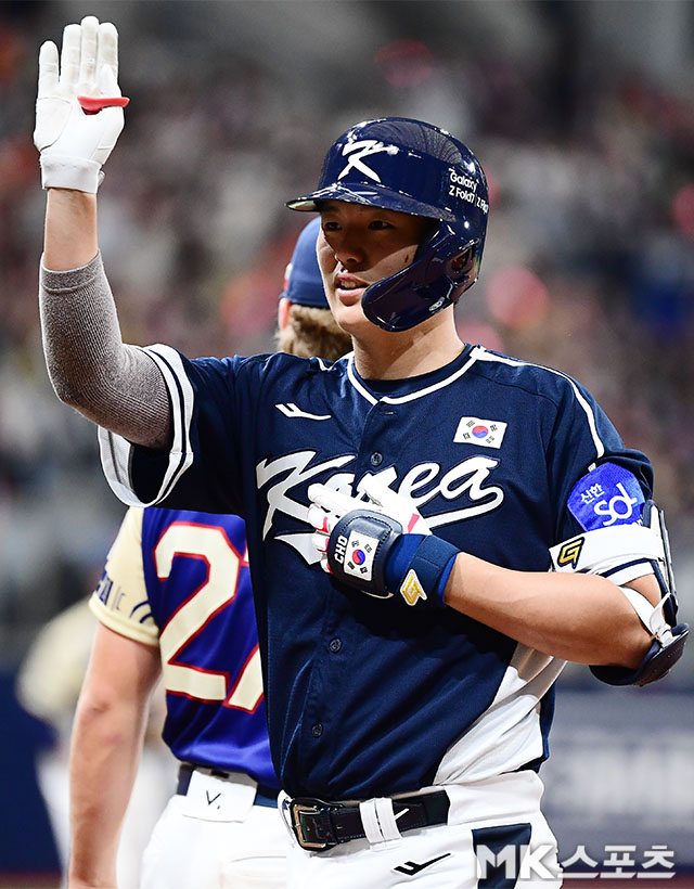 2회초 2사 1루에서 대표팀 조형우가 우중간 안타를 치고 출루하고 있다.