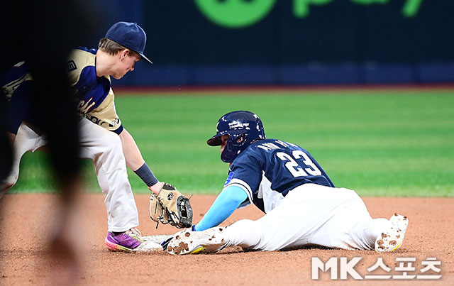 3회초 1사 1, 3루에서 1루주자 대표팀 송성문이 2루 도루를 성공하고 있다.