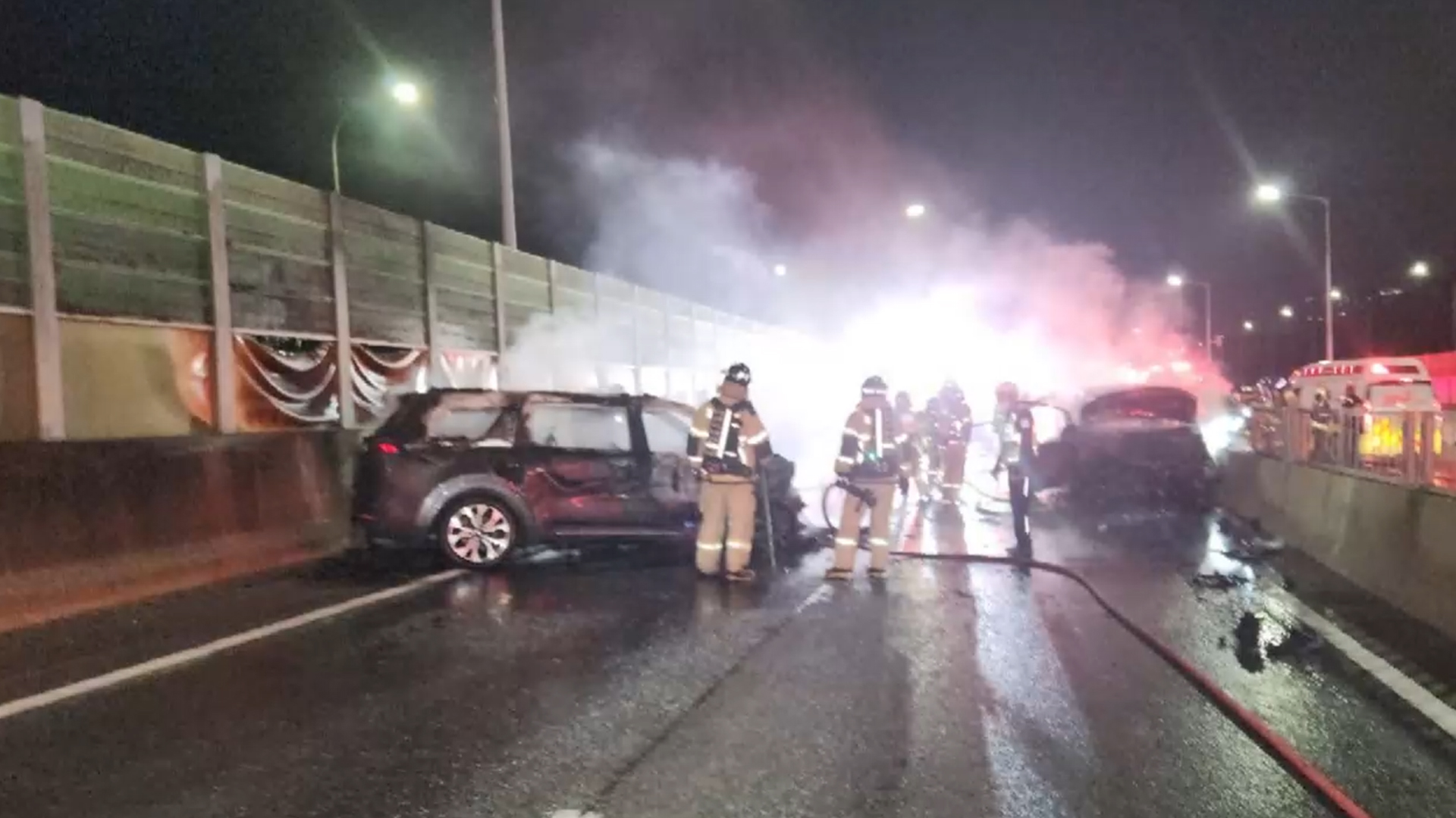 이 사고로 승합차에 타고 있던 30대 등 6명이 다쳐 병원으로 이송됐고 사고 차량 2대와 방음벽 일부가 불에 탔습니다.