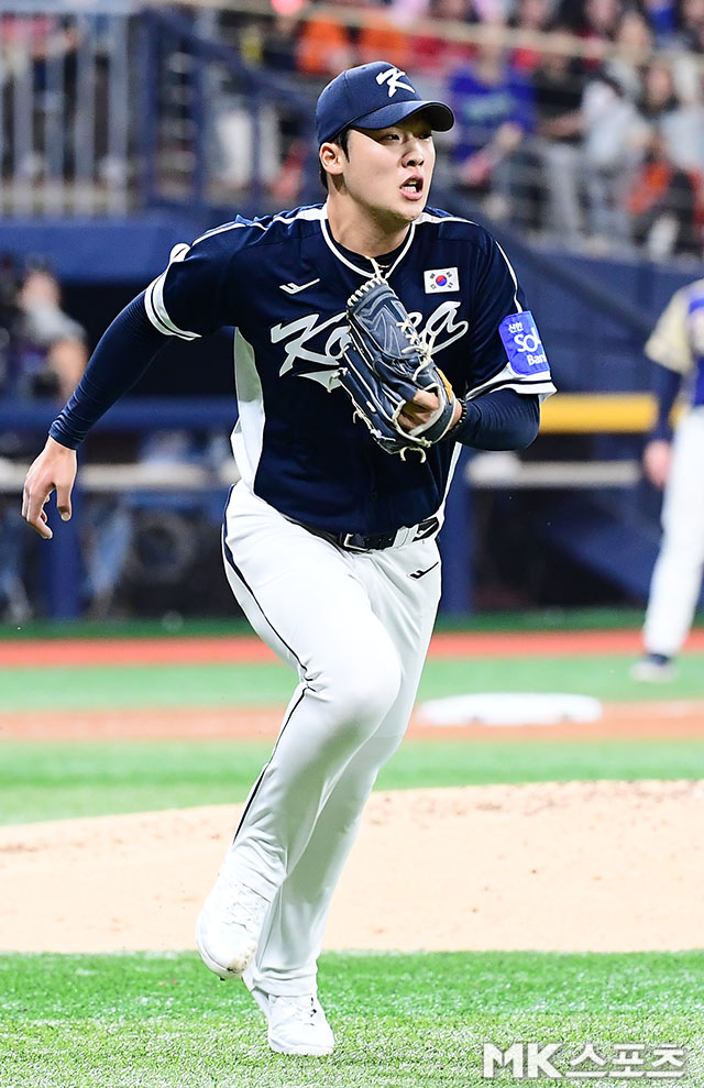 3회말에 등판한 대표팀 이민석이 체코 원클러의 1루 땅볼때 1루 커버에 들어가고 있다.