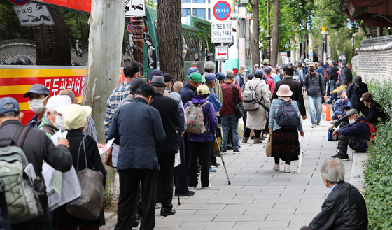 서울 종로구 탑골공원에서 어르신들이 무료급식을 기다리며 대기하고 있다. 기사와 직접적 연관 없음. 우상조 기자 |