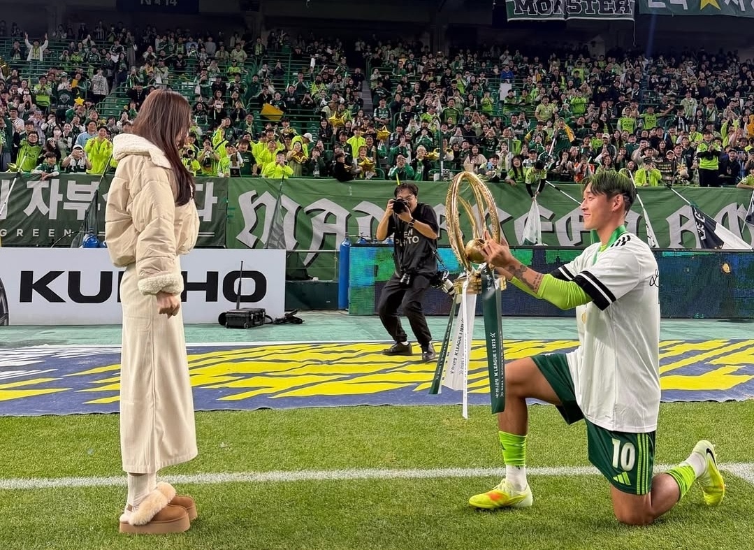 12월 화촉을 밝히는 국가대표 출신 공격수 송민규가 아나운서 곽민선씨에게 우승 메달을 목에 걸어주고, 트로피를 바치는 장면이었다.