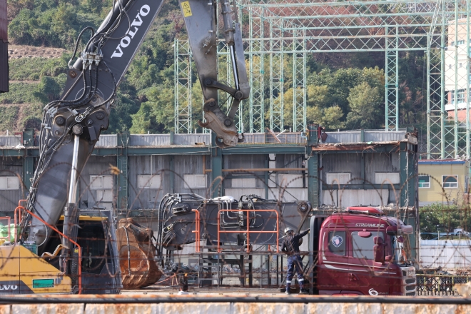 울산화력발전소 보일러 타워 붕괴 사고 나흘째인 9일 오후 발전소 내부에서 보일러 타워 4·6호기 발파 사전 작업을 위해 투입된 중장비들이 분주히 움직이고 있다. 울산 연합뉴스 |