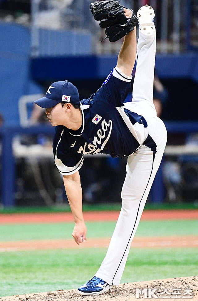 9회말에 등판한 대표팀 김영우가 역투하고 있다.