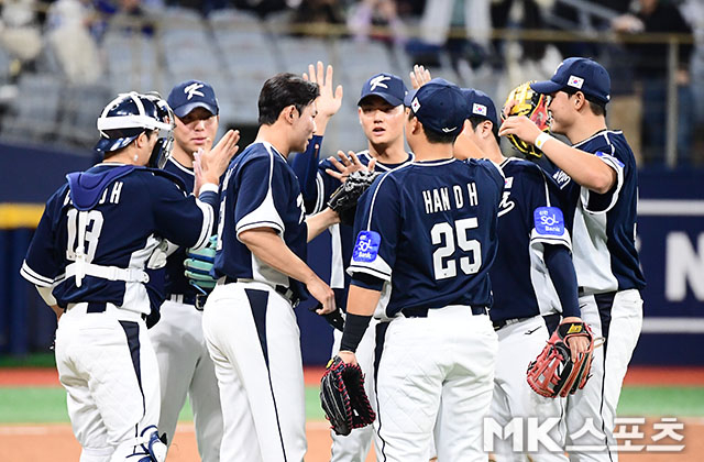 11-1 대승을 거둔 대표팀 선수들이 마운드에서 승리의 기쁨을 나누고 있다.