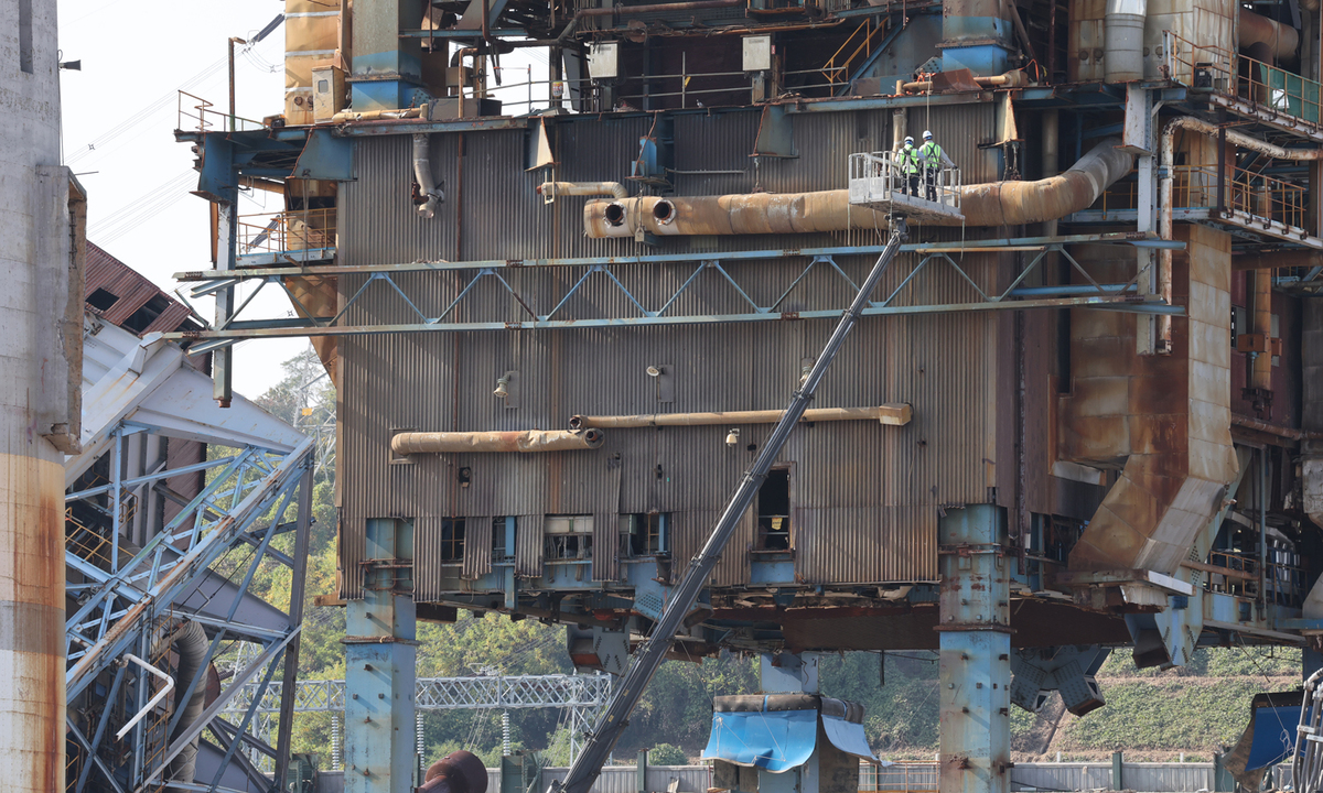 울산화력발전소 보일러 타워 붕괴 사고 나흘째인 9일 발전소 내부에서 보일러 타워 4·6호기 발파 사전 작업을 위해 고소작업차가 투입돼 타워 외부를 살피고 있다. 연합뉴스 |