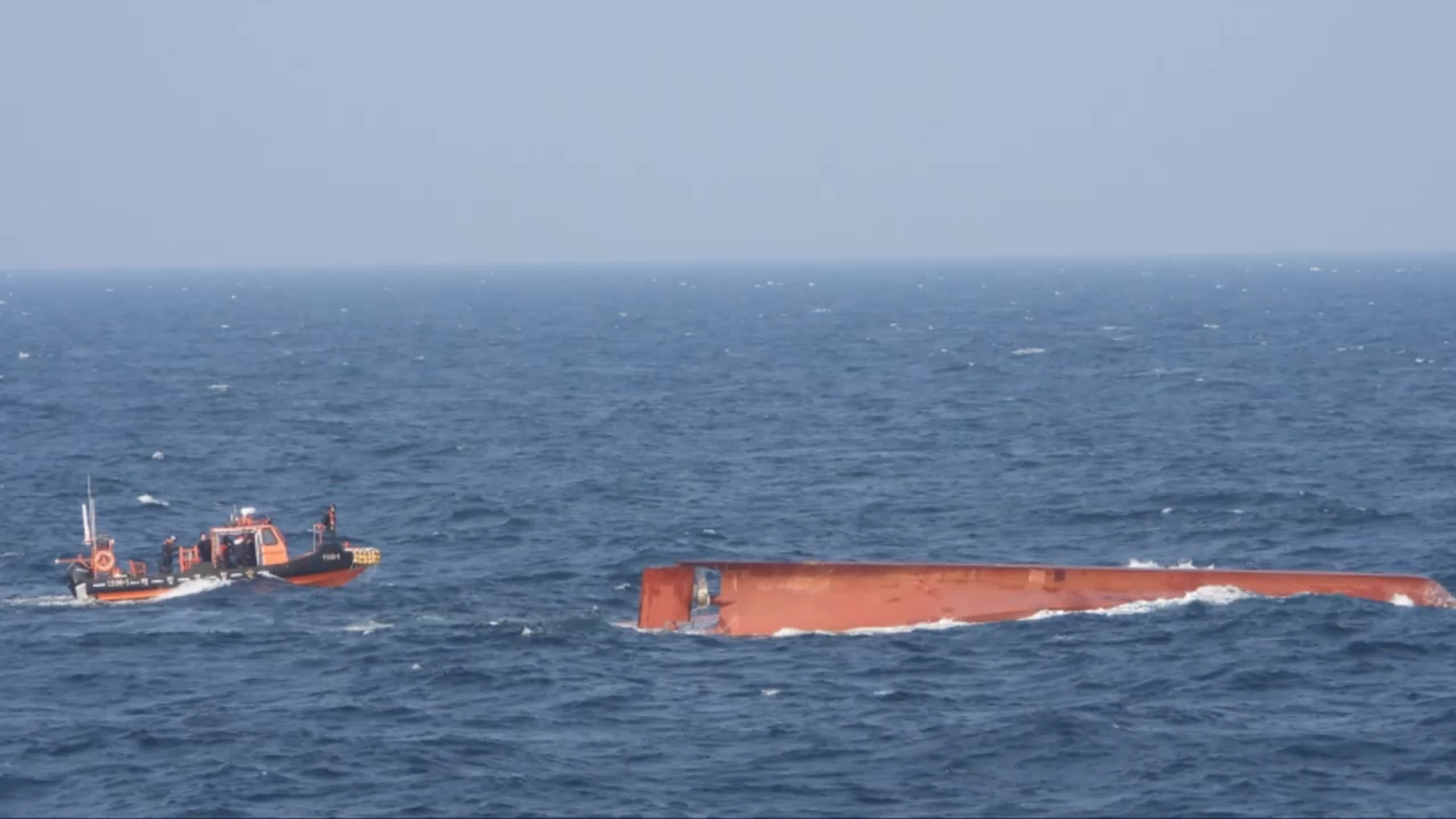 뒤집힌 배가 바다 한 가운데 위태롭게 떠 있습니다.