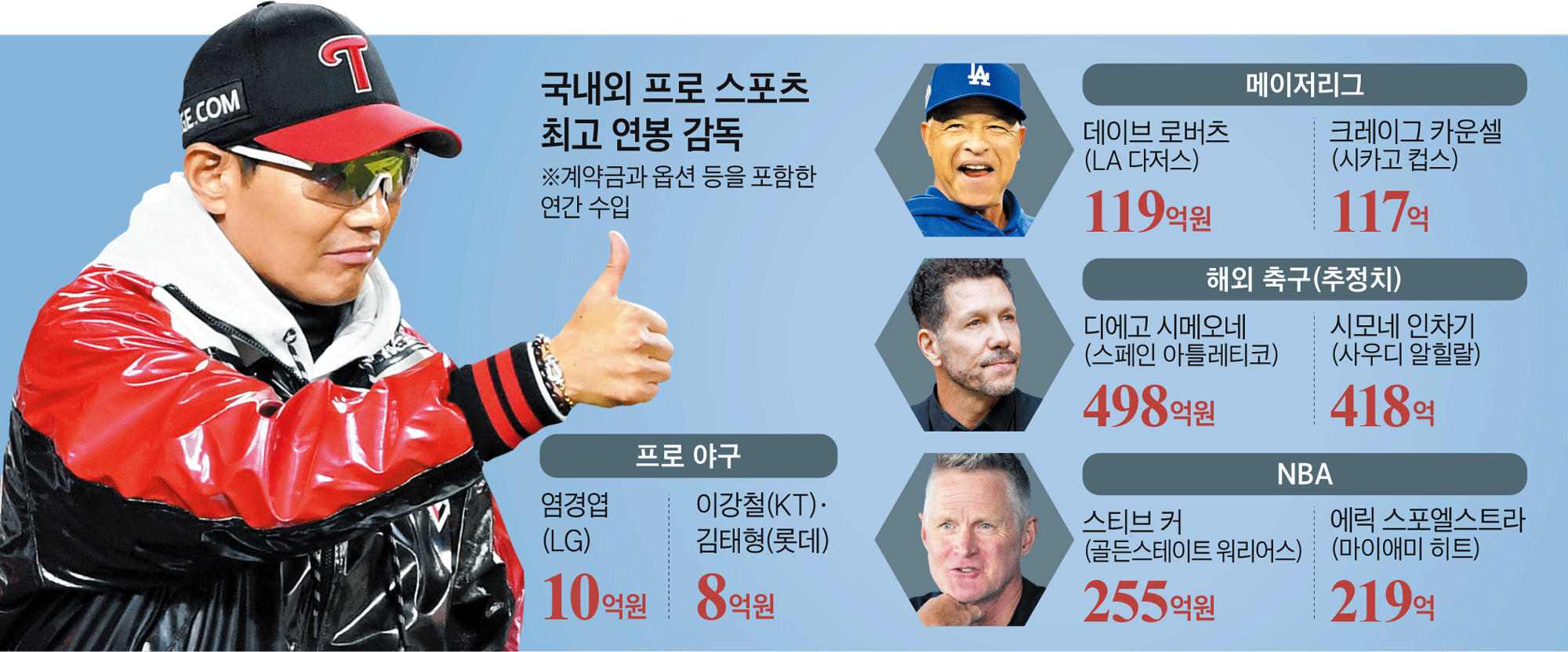 한국 프로야구 감독 중 처음 연봉 1억원을 달성한 이는 1995년 삼성의 백인천 감독. 2008년 11월 김성근 감독이 SK(현 SSG)와 3년 총액 20억원에 최고 대우로 계약한 이후 류중일(삼성·LG), 김경문(NC·한화), 김태형(두산), 김기태(KIA) 등 지도자들이 줄줄이 3년 20억원대 계약을 맺었다. 지난해 통합 우승을 이끈 이범호 KIA 감독은 ‘우승 프리미엄’을 안고 3년 26억원에 재계약했다.