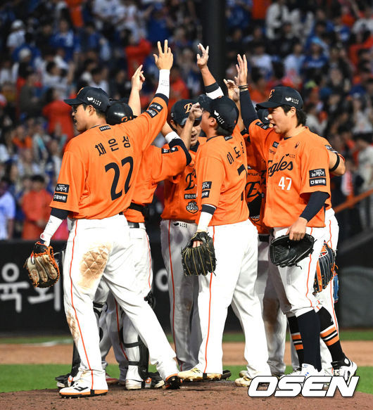 [OSEN=대전, 이대선 기자] 한화 선수들이 승리의 기쁨을 나누고 있다. 2025.10.18 /sunday@osen.co.kr |