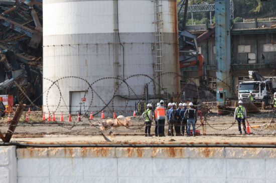 울산화력발전소 보일러 타워 붕괴 사고 나흘째인 9일 오후 발전소 내부에서 관계자들이 보일러 타워 4·6호기 발파 사전 작업에 대해 논의하고 있다. 연합뉴스 |