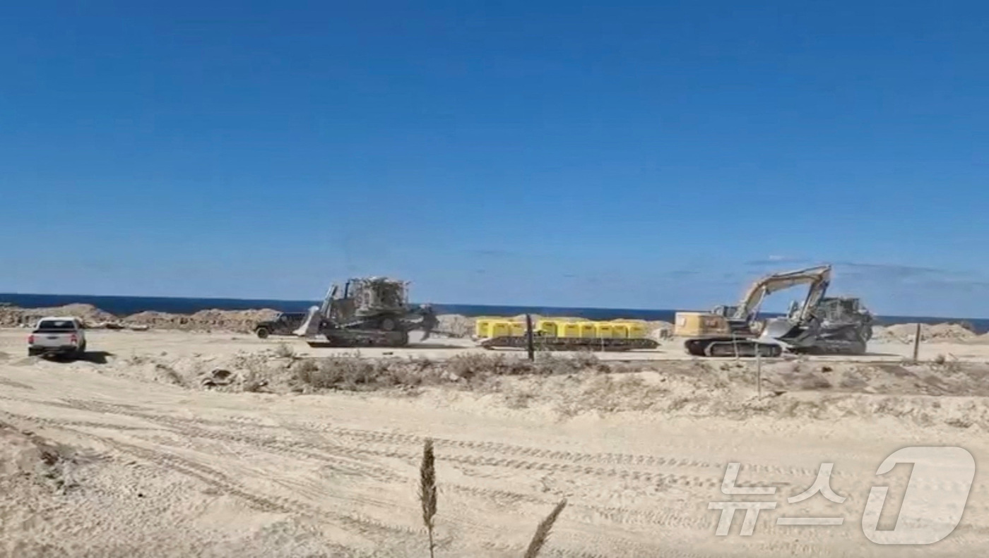 한 차량이 20일 가자지구에서 이스라엘군의 임시 후퇴선을 표시하는 노란색 콘크리트 표지를 나르고 있다. 2025.10.20 ⓒ 로이터=뉴스1 ⓒ News1 강민경 기자 |