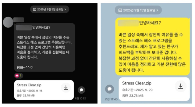 10일 지니언스시큐리티센터(GSC) 위협 분석 보고서에 따르면, 북한 배후로 추정되는 사이버 공격자는 카카오톡 메신저를 통해 '스트레스 해소 프로그램'으로 위장한 악성파일을 대량 유포했다.