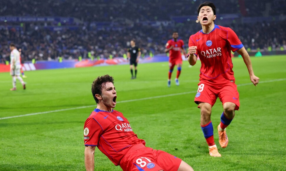 이강인(오른쪽)이 10일(한국시간) 열린 2025~2026 프랑스 리그1 12라운드 올랭피크 리옹과의 원정 경기에서 막판 결승골을 터트린 주앙 네베스와 함께 기뻐하고 있다. 리옹/로이터 연합뉴스 |