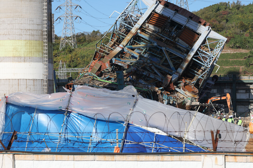 10일 오전 울산 남구 한국동서발전 울산화력발전소 보일러 타워 붕괴현장에서 관계자들이 얘기를 나누고 있다. 최현수 기자 emd@hani.co.kr |