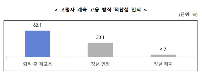10일 한국중견기업연합회(중견련)가 발표한 ‘중견기업 계속 고용 현황 조사’에 따르면 중견기업의 62.1%는 기업의 지속가능성을 확보하기 위한 고령자 계속 고용 방식으로 ‘퇴직 후 재고용’을 꼽았다. ‘정년 연장’과 ‘정년 폐지’를 선택한 기업은 각각 33.1%, 4.7%를 기록했다.