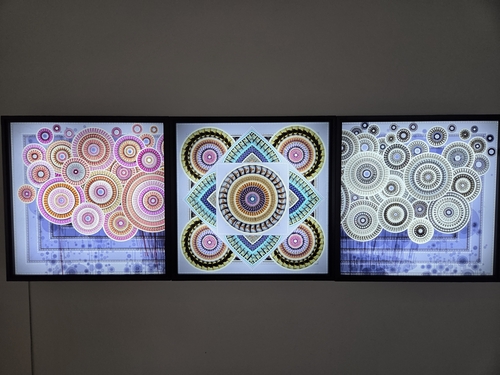 '숨겨진 감성'은 세로로 긴 아크릴판 3개를 나란히 배치하고, '만다라'처럼 수많은 원형을 겹쳐 화면을 가득 채운 작품이다. 평면이지만 원이 솟아오르는 것 같은 입체감을 느낄 수 있다.