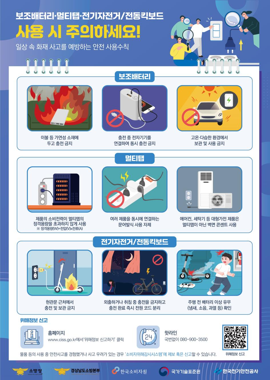 먼저 보조배터리는 고온·다습한 환경에서 사용하거나 보관하지 않도록 하고, 멀티탭은 여러 전기제품을 동시에 연결하지 않고, 과부하 사용을 자제해야 한다.