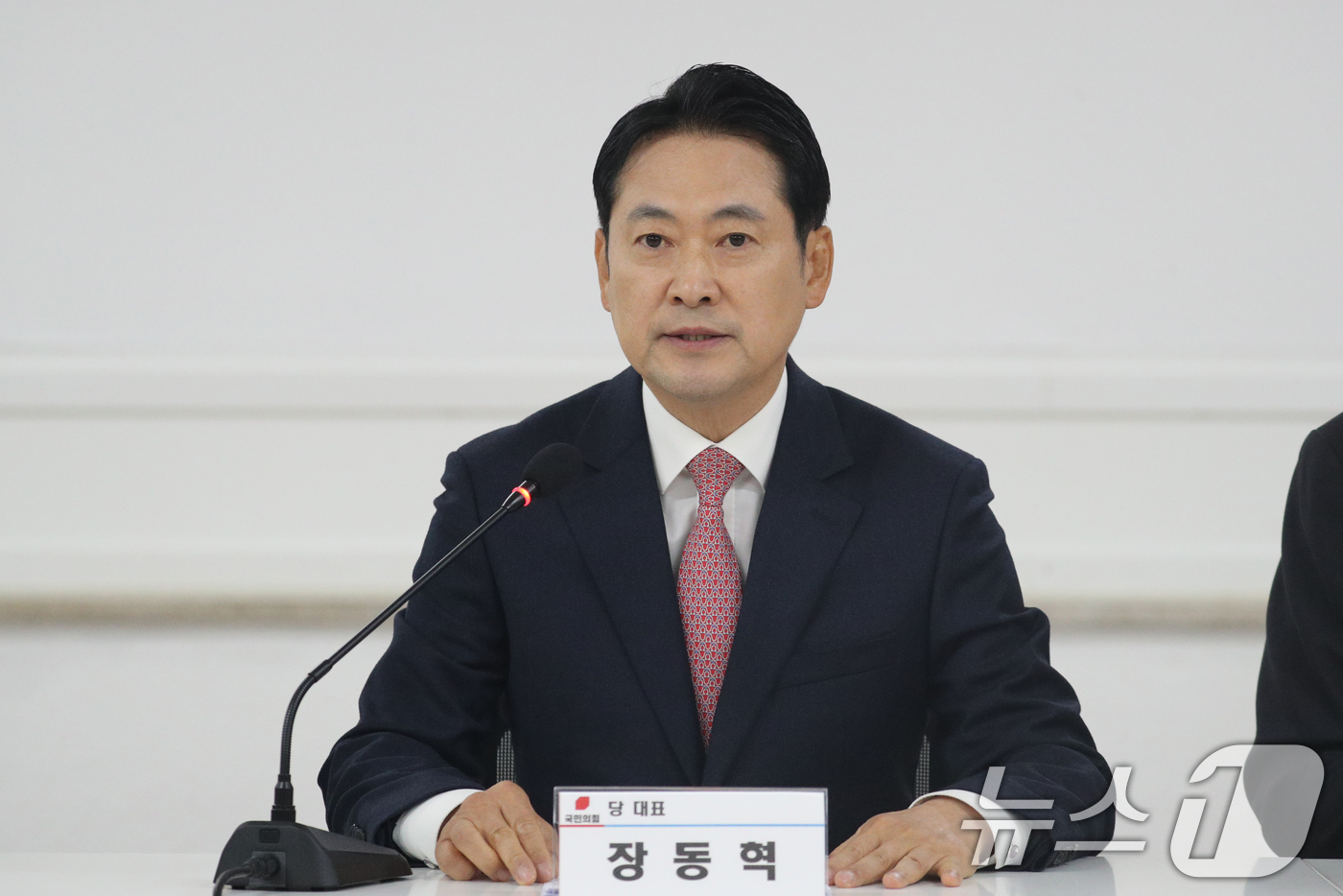 장동혁 국민의힘 대표가 10일 충북 청주시 흥덕구 복대동 충북도당사에서 열린 최고위원회의에서 모두발언을 하고 있다. 2025.11.10/뉴스1 ⓒ News1 김용빈 기자 |