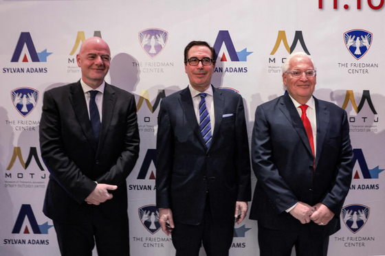 (오른쪽부터 왼쪽) 데이비드 프리드먼 전 주이스라엘미국대사와 스티브 므누친 전 미 재무장관, 지아니 인판티노 FIFA 회장이 2021년 10월 11일(현지시간) 예루살렘 관용 박물관에서 열린 "힘을 통한 평화를 위한 프리드먼 센터" 출범식에 참석했다. AFP=연합뉴스 |