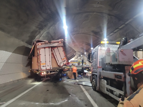 (영동=연합뉴스) 박건영 기자 = 10일 낮 12시 31분께 충북 영동군 심천면 경부고속도로 부산 방향 영동1터널 안에서 A(60대)씨가 몰던 25t 화물차가 앞서가던 24t 화물차와 옆 차로의 승용차를 잇따라 추돌했다.