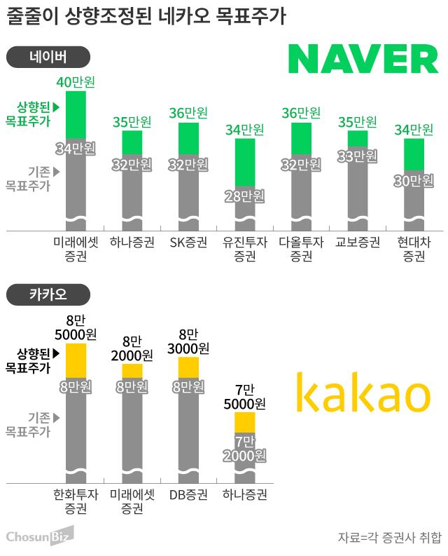 네이버와 카카오가 올해 3분기 사상 최대 매출액과 영업이익을 낸 후 증권사들이 두 회사에 대한 목표주가를 줄줄이 상향조정하고 있다.
