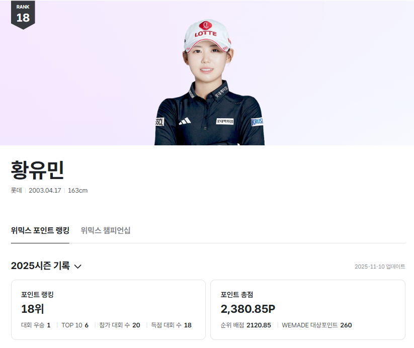 한편, KLPGA 이벤트 대회인 ‘위믹스 챔피언십(총상금 10억원)’은 위믹스 포인트 랭킹 상위 24명의 선순에게만 출전권이 주어진다. 황유민은 위믹스 포인트 랭킹 20위권이라 출전을 확신할 수 없었다. 하지만 이번 우승으로 위믹스 포인트 600점을 추가해 전주 대비 4계단 상승한 18위(2,380.85점)로 올라 이번 주 위믹스 챔피언십 출전을 결정했다.