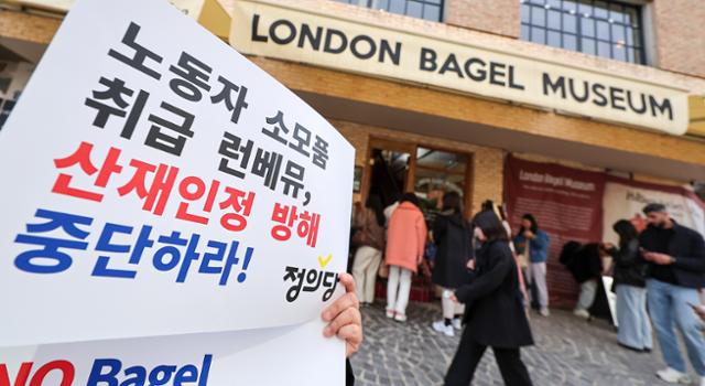 지난달 30일 런던베이글뮤지엄에서 근무한 20대 직원이 과로로 사망했다는 의혹과 관련, 서울 종로구 런던베이글뮤지엄의 한 매장 앞에서 정의당 관계자가 손피켓을 들고 있다. 뉴스1 |