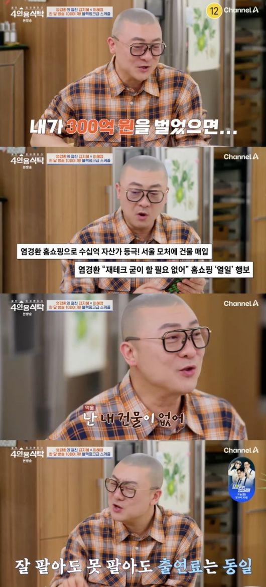 염경환은 ‘4인용식탁’ 촬영 중에도 홈쇼핑 관련 연락을 받았다. 매니저가 없는 염경환은 직접 업무 연락까지 받으며 분주한 시간을 보냈다. 이를 지켜보던 이혜정은 “(연 수익) 300억 가능하다니까”라고 덧붙였다.