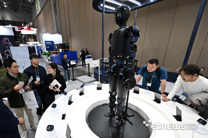 로보월드 2025가 5일 경기 고양시 킨텍스에서 열렸다. 올해로 20회를 맞은 이번 전시에는 피지컬AI에 대한 정부·민간 기업의 관심이 높아진 가운데 300여 국내 기업과 50여 개의 해외 기업이 참가해 역대 최대 규모로 열렸다. 참관객이 본시스템즈의 자체 부품 제조 기술로 개발중인 휴머노이드 로봇을 살펴보고 있다. 이동근기자 foto@etnews.com |