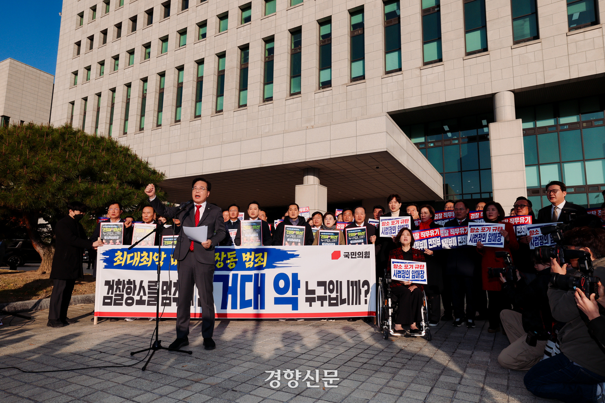 송언석 국민의힘 원내대표가 11일 소속 의원들과 함께 서울 서초동 대검찰청을 항의 방문해 검찰의 대장동 사건 항소 포기를 규탄하고 있다. 이준헌 기자 |